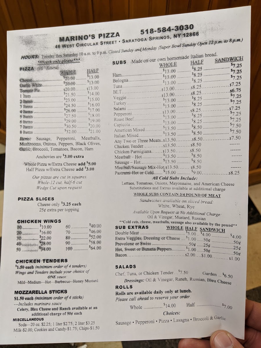 Welcome to Marino's Pizza, a must-visit gem nestled at 46 W Circular St in Saratoga Springs, NY. This charming pizzeria prides itself on delivering exceptional flavors that leave a lasting impression. The menu features a harmonious blend of hearty offerings, including thoughtfully crafted salads starting at just $6, and timeless 16" round pizzas that cater to every palate.
